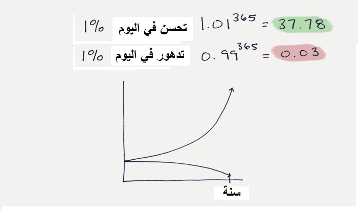 نسبة 1% من التحسن يوميا تتراكم وتعطي نتائج مدهشة مع الوقت، وكذلك يفعل التدهور اليومي بنفس النسبة. بدل أن تحاول فعل شيء مدهش من البداية، ابدأ بشيء بسيط وحسنه مع الوقت، ومع الوقت سوف تزداد إرادتك وحماسك وهو ما يجعل الأمر سهلا وتداوم على العادة الجديدة وتصبح شيئا عاديا بالنسبة لك.