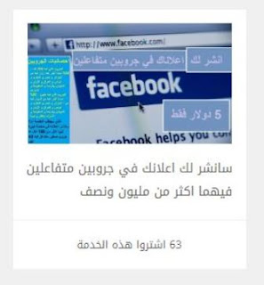هذه مثال لخدمة النشر في قروبات الفيسبوك هذه الخدمة اشتراها 63 شخص وبما هؤلاء الاشخاص اشتروها اكثر من مرة كما انه واضع تطويرات للخدمة الى 40 دولار يمكنك الاطلاع عنها بالضغط هنا .